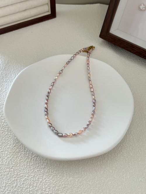 The 3–4mm freshwater baroque shapes offer a refreshing, modern movement and a delicate silhouette around the neckline. Featuring a whimsical palette of candy colors—ranging from soft lavenders to warm peaches—this piece is designed to be a versatile staple that feels both artisanal and elevated.